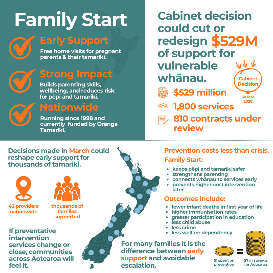 Family Start is a nationwide early intervention home visiting service supporting whānau from pregnancy through early childhood.The programme is now under review as part of a broader $529 million reassessment of services for vulnerable families. While contracts have been temporarily extended to March 2027, Cabinet decisions in late March 2026 will determine the future of Family Start and similar prevention services.At the same time, recent coroner and oversight body findings following the death of Malachi Subecz have highlighted ongoing gaps in the child protection system, including incomplete implementation of key recommendations from the late Dame Karen Poutasi’s review. These findings reinforce the importance of strong, community-based prevention.The evidence is clear: early support delivered by trusted, local providers plays a critical role in keeping tamariki safe and reducing pressure on crisis services.Family Start is a core part of that prevention system. Reducing or weakening it risks widening the very gaps these reviews have identified — at a time when strengthening early intervention is most needed.